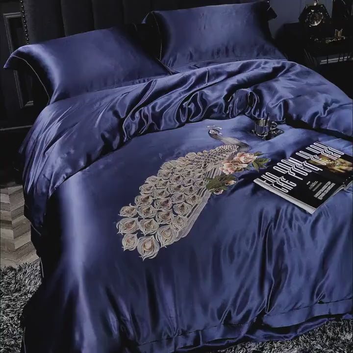 The silk peacock embroidery four-piece set is the epitome of a high-quality lifestyle, transforming the bedroom into an exclusive haven where every night is immersed in the embrace of luxury and beauty. Experience the beauty of luxury and let your bedroom radiate a unique glow.