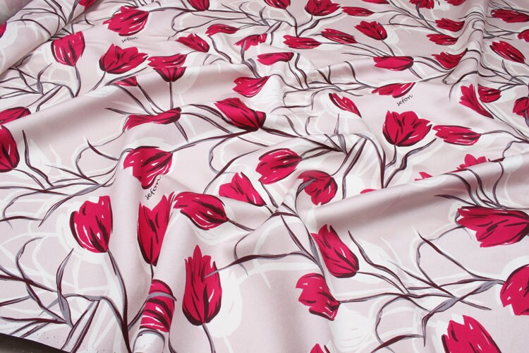 Red Tulip Print Mulberry Silk Wool Cotton Fabric - 135cm wide by the Yard