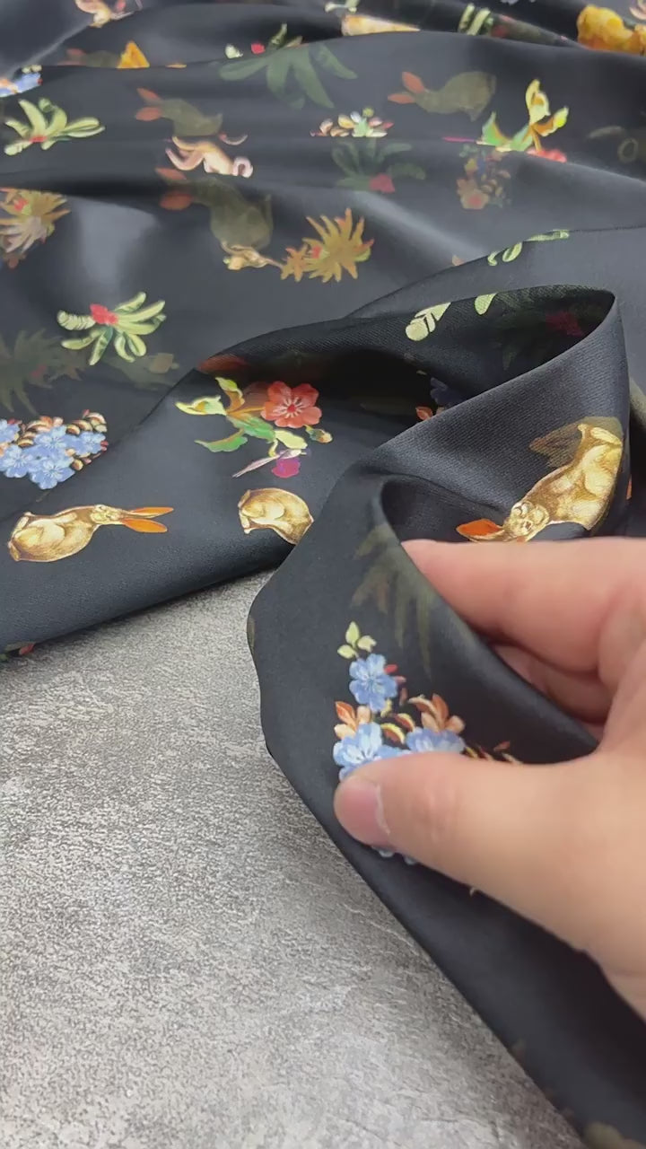 BUBHTZ - 21 Momme  Black Background Rabbit Digital Print Stretch Silk Satin Fabric - 140cm wide by the Yard