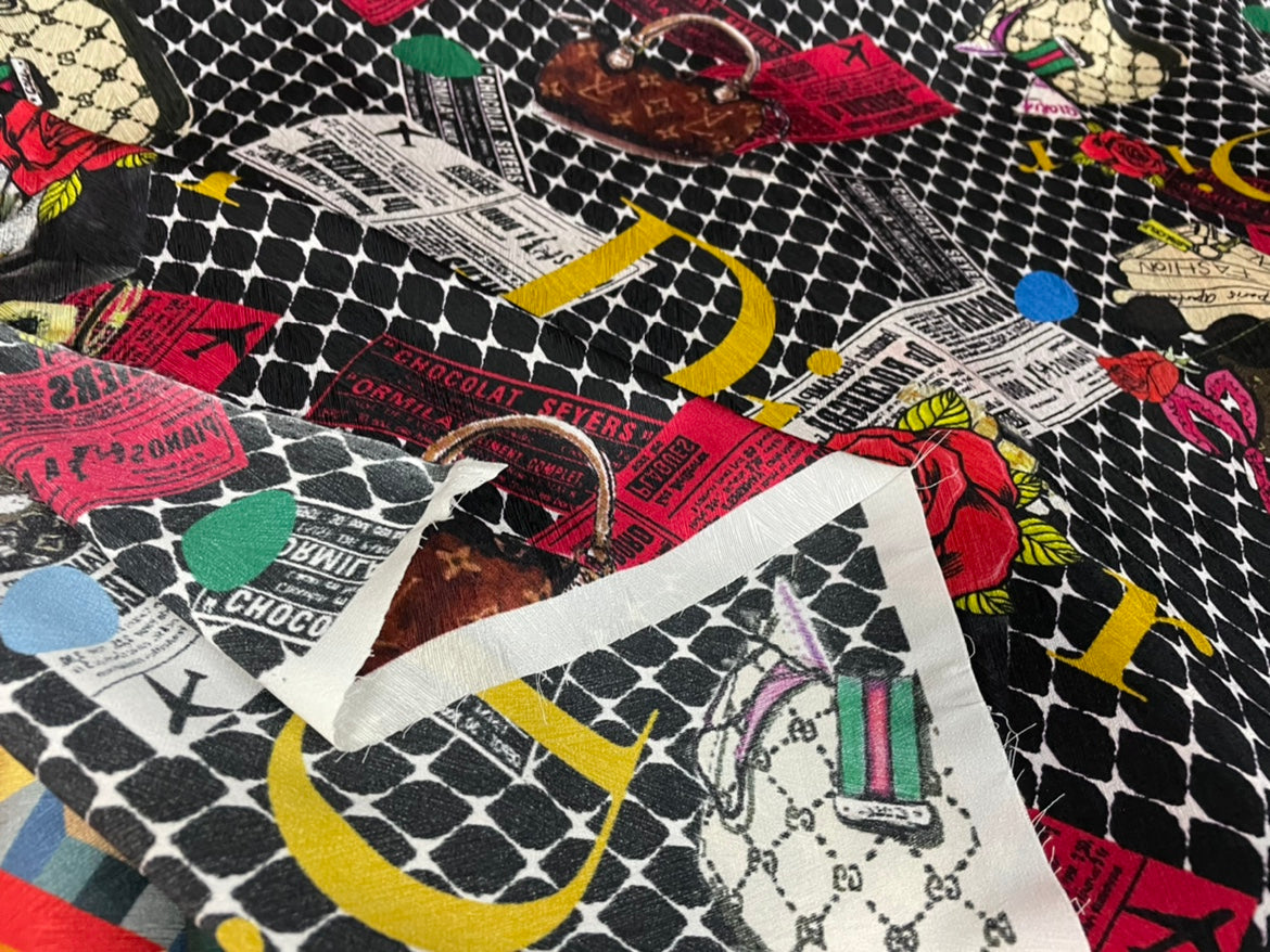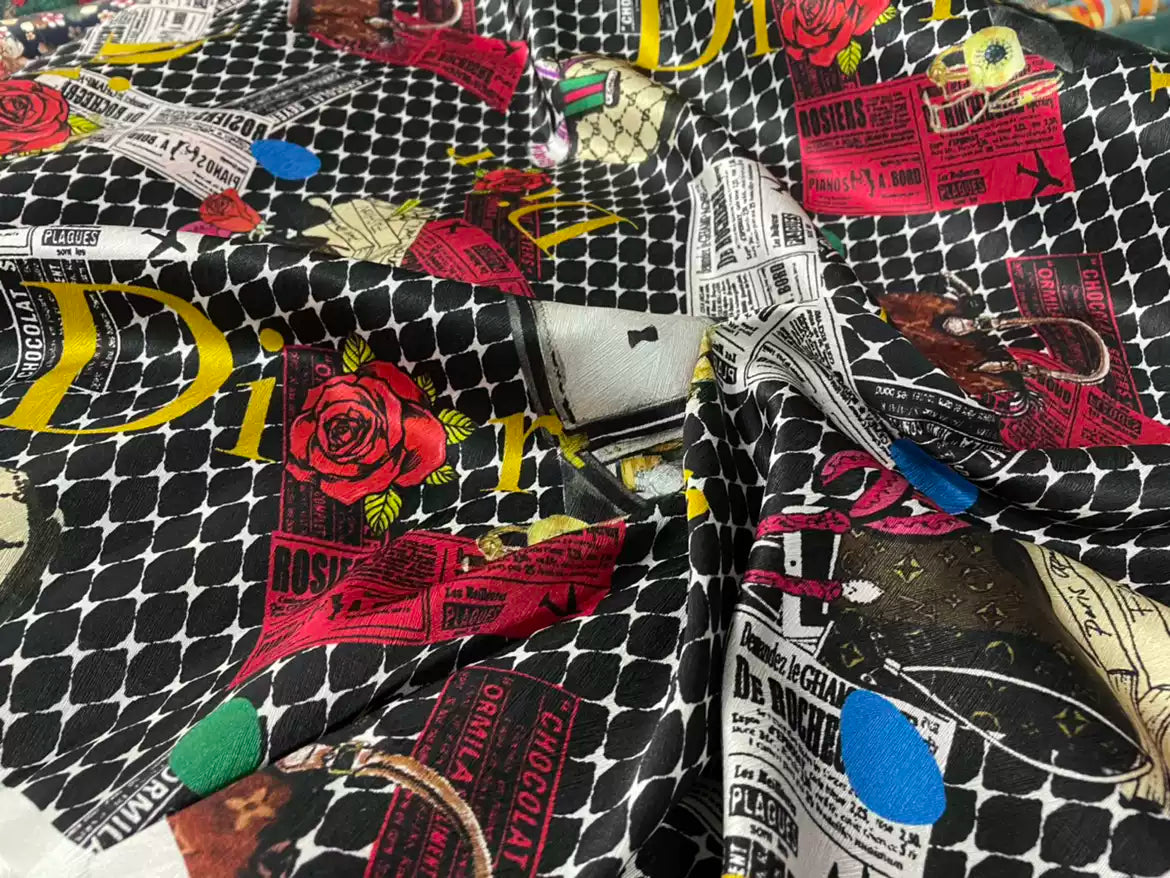 DIORHO - 19 Momme Retro Style Red letter D Pattern Digital Print Stretch Silk Satin Fabric - 108cm wide by the Yard