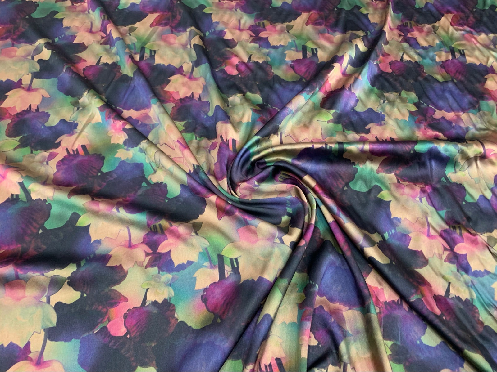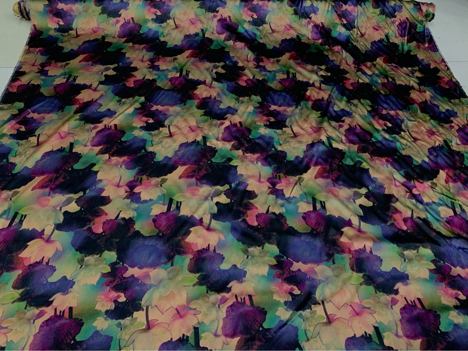 SENZFA - 19 Momme Dark Purple Flowers Pattern Digital Print Stretch Silk Satin Fabric - 108cm wide by the Yard