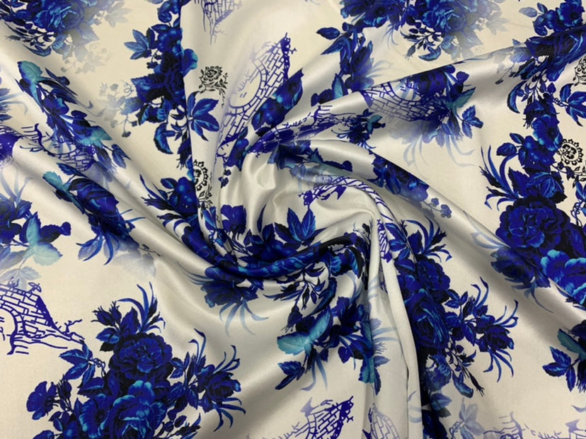 QINFAC - 19 Momme Blue and White Porcelain Pattern Digital Print Stretch Silk Satin Fabric - 140cm wide by the Yard