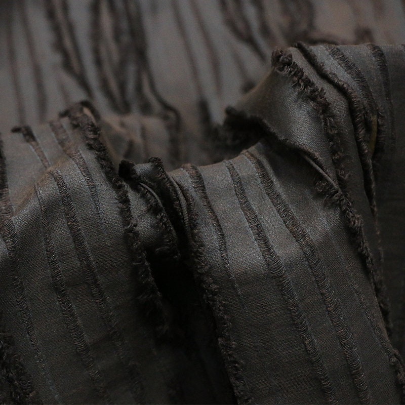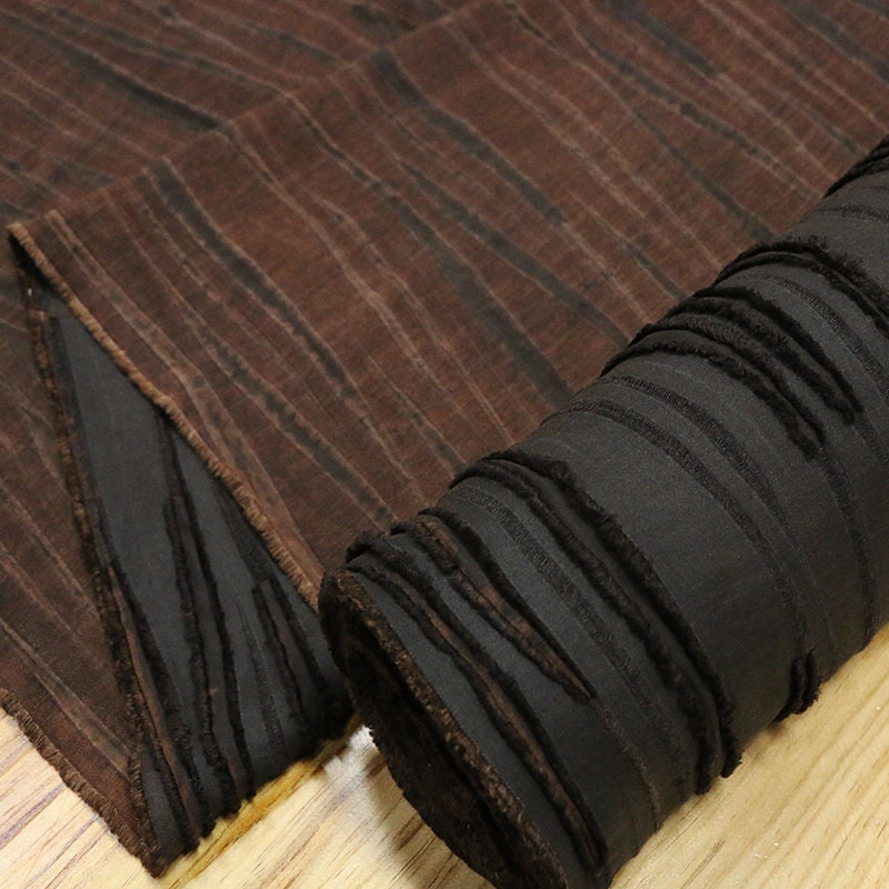 Gambiered Canton Silk (also known as Mud Silk) is a traditional and special silk fabric produced only in ShunDe Guangdong which is dyed with plant and then with local mud. It takes months to produce and each production is unique with limited metres. Due to its handmade procedure, all the fabrics will naturally have few black spots, white/brown marks, color stains, etc, especially on the back side of the silk. It also will have small holes, color difference and scratches on the 5cm fabric edges.This special silk fabric is durable and easy to sew. A dream material for summer garments. Two layers, thick type silk so it can be used for light weight jacket, trentch coat, etc.