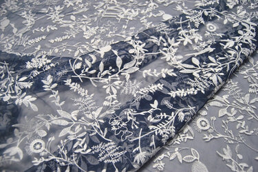 This beautiful White and Navy Blue embroidery silk organza is structured, not drapy. Background material is 100% mulberry silk, embroidery with Polyester threads. Ideal for long dresses, evening dresses, outer coat for summer.